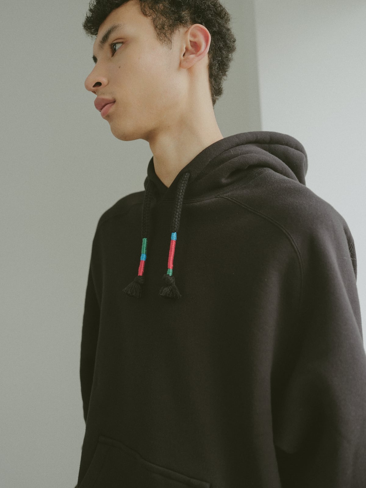 フード部分の紐は、手作業で刺繍を入れてポイントにしています。